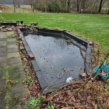Hieronder wat foto's van een vijver die we hebben gerenoveerd, en een mooie natuurlijke beekloop hebben aangelegd met een klein plantenfilter als start van de beekloop.